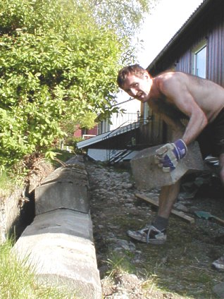 Etter å ha gjort skikkelig grunnarbeid så var det å begynne å sette steinene på plass igjen. |
