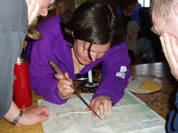 Utpå ettermiddagen kom det flere til hytta. Og kartene ble flittig brukt for å beskrive hvor vi hadde gått og turer neste dag.