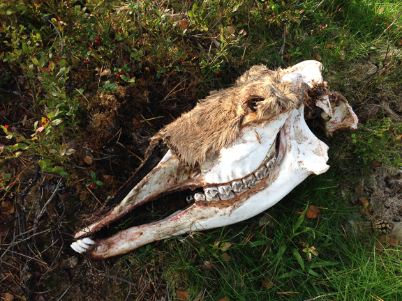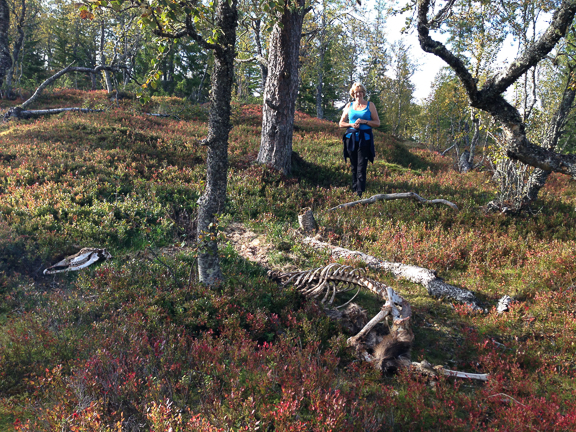 Søndag gikk vi på sopptur. Her er vi kommet over et elgekadaver.