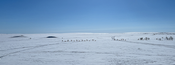 Så svinger sporet ut på Jiesjavri. Det er Finnmarks største innsjø. Den er 13 km lang.