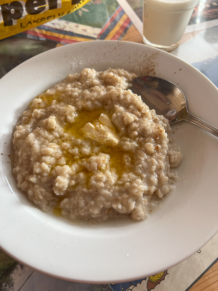 Jeg fikk tildelt et eget rom i en hytte. Det er såpass lenge til middag at jeg tar en pose med havregrøt.
