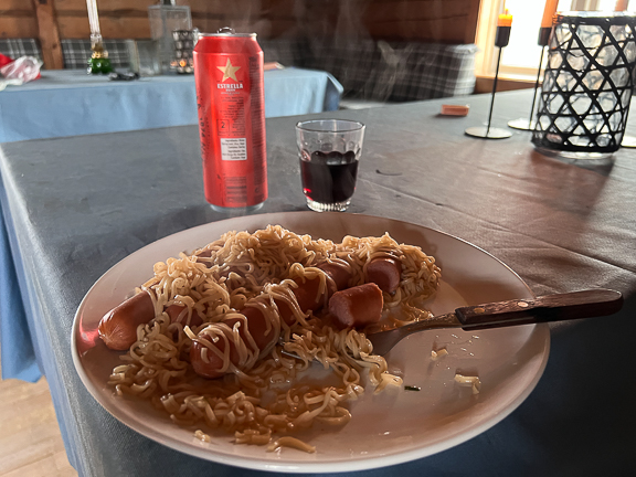 Det var ikke noen stor fest over middagen. Nudler med pølse er ikke akkurat noen gourme. Men drikken var god. Så jeg tenkte av på disse turene skal jeg være litt nøyere med middagsmaten.