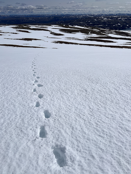 Jeg holdt utkikk hele tiden etter rein og hadde mistet håpet om å få se noe på denne turen, men på vei ned fra Haukfjellet kom det en liten flokk på 12 dyr. Simler og kalver. Fint å se i kikkerten når kalvene dier, men de hadde det travelt og dro forbi før jeg fikk tatt bilder. Men de er der ute.