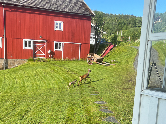Mye rådyr nå og det ble dramatisk nedenfor stua i Staverløkja. Onsdagskveld var det en geit og to killinger som koste seg i regnet. Killingene hoppet, lekte og sprang i gresset mellom turene til mor for å få melk. Mora slikket og stelte de og det var en fryd å se på.