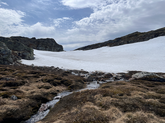 Så gikk jeg til Sandfjellet. Fortsatt snø i Portdalen.