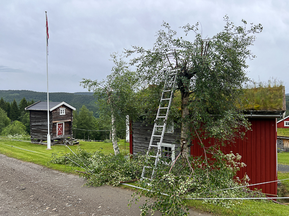 Alt vokser så utrolig raskt. Her trimmer jeg bjørkene ved eldhuset.