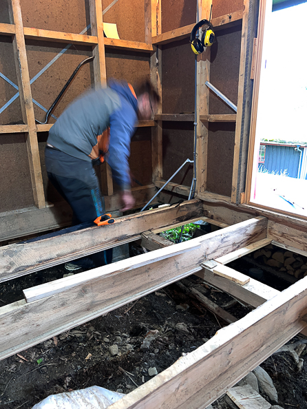 Jomar ville gjøre om uthuset til anneks, så her er vi igang med gulvet.