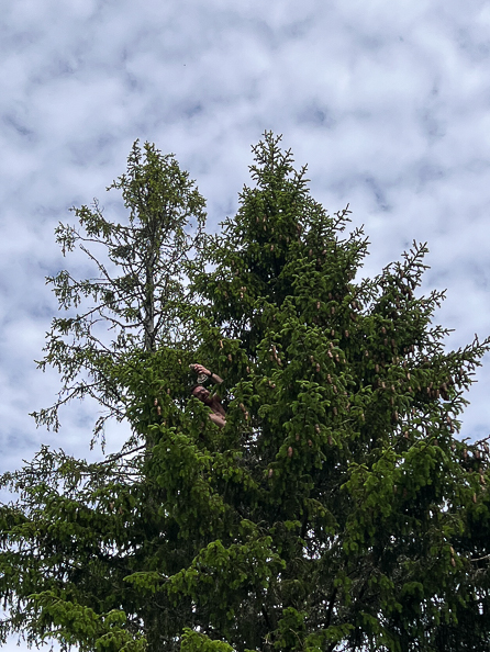 Et tårnfalkpar har bygget reir i grana som står nærmest hytta. Når har de fått frem 3 unger.