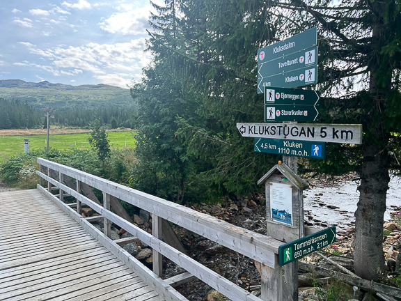 Her er det skiltet til Storlien, Litjkluken, Kluktjønna, Klukstuggu... Vinterstaking starter også ved gården her.