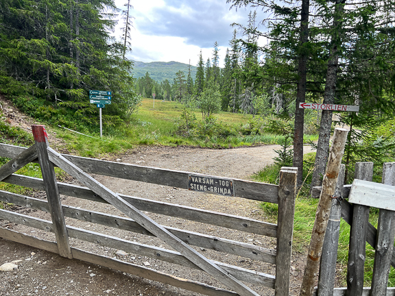 Vi gikk gjennom gården og tok inn på seterveien på andre siden. Det var skiltet til flere turmål herfra.