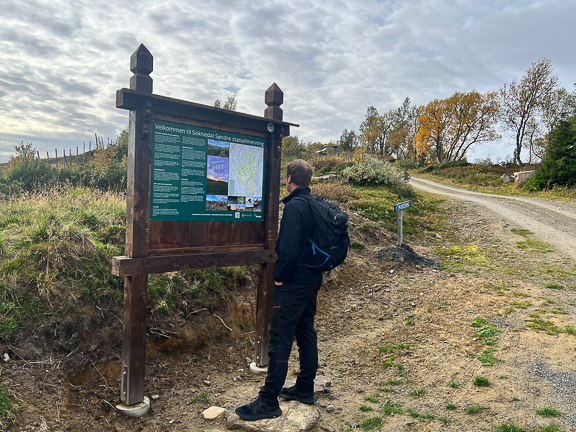 Oppslagstavle med informasjon om Soknedal søndre statsalmenning ved parkeringsplassen.
