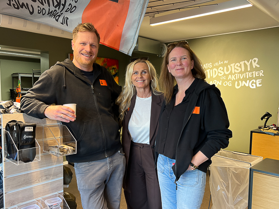 Dette er Eimunds nye arbeidsplass. Her sammen med sjefen og sjefens sjef ifbm åpningen.