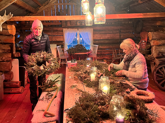 Så er det produksjon av kranser. Her har Anette allerede laget en.