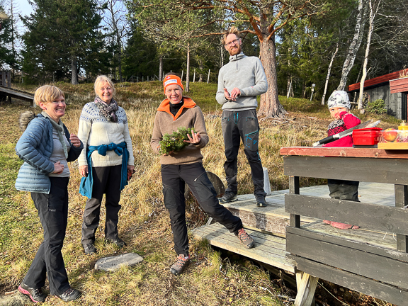 Vi gikk en tur igjen søndag for å lete etter en saks vi mistet på turen dagen før. Og jammen fant Aslaug den. Her er vi ved hytta og Sunniva får en krans til hyttedøra.