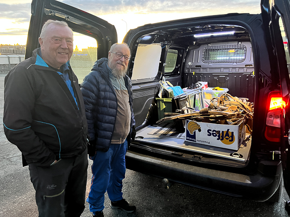 På vei til byen hadde jeg med en god del hestgre. Historielaget har mye hesteredskap på Marken, men manglet hestgre. Her får de hestgreet som var brukt i Staverløkja. Kristian Eggan til venstre.