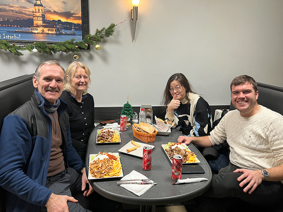 Yaping spiser før de kjører oss til flyplassen for å dra tilbake til Norge.