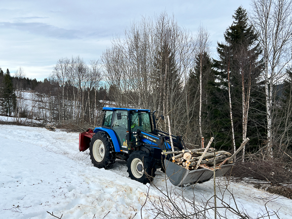 Etter åpningen på Rema1000-butikken dro vi til Soknedal igjen. Jeg holder på med vedarbeid. I år er det lite snø og jeg kan kjøre ned veden med New Holland'en.