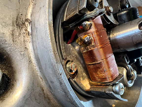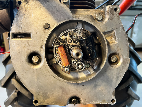 Nå hadde vi endelig satt av litt tid til å sette sammen motoren igjen. Helge skrur på plata med tenningskomponentene.